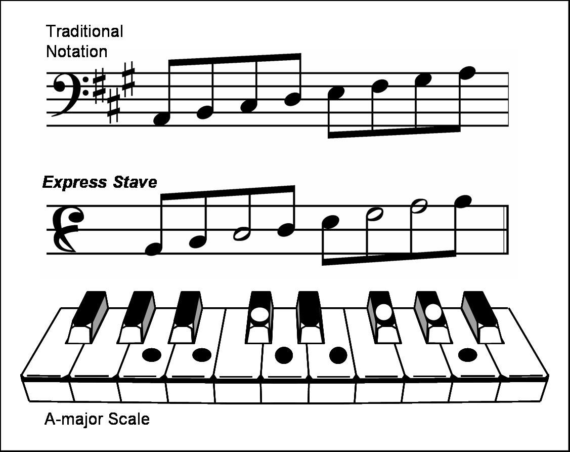 My preferred version of Express Stave, is the 'reverse colour' version, where the naturals (white keys on a piano) are represented with black note-heads, and the black keys (sharps and flats) have white note-heads. See the following PDF files for illustration: