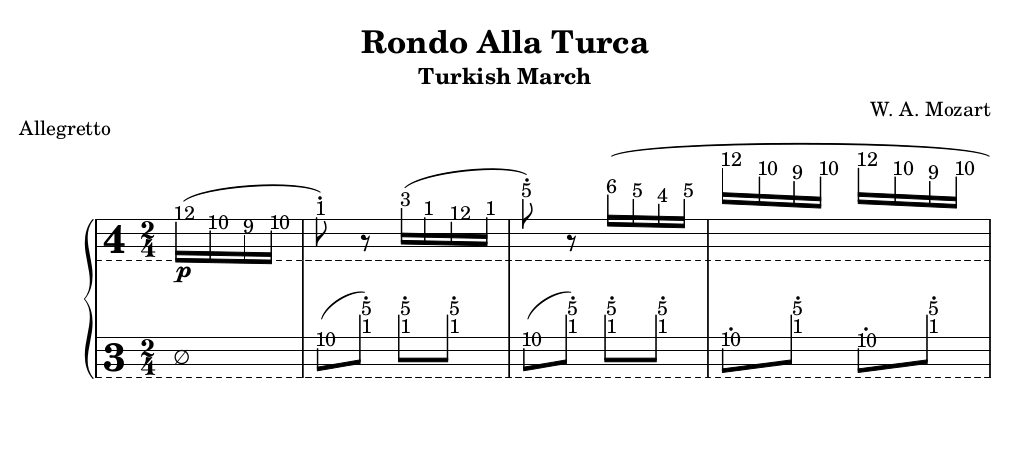 This version was presented at numberednotes.com from 2009 to 2012. It uses a chromatic (12-note) staff with lines placed three semitones apart, and features a “counts per measure” timing system in which notes are modified to be “fractional” or “multiple” in a consistent way. Details can be found in this post. See also this page on our main site. Below is the start of Mozart’s “Rondo Alla Turca” rendered in Numbered Notes. The full piece is available here.
